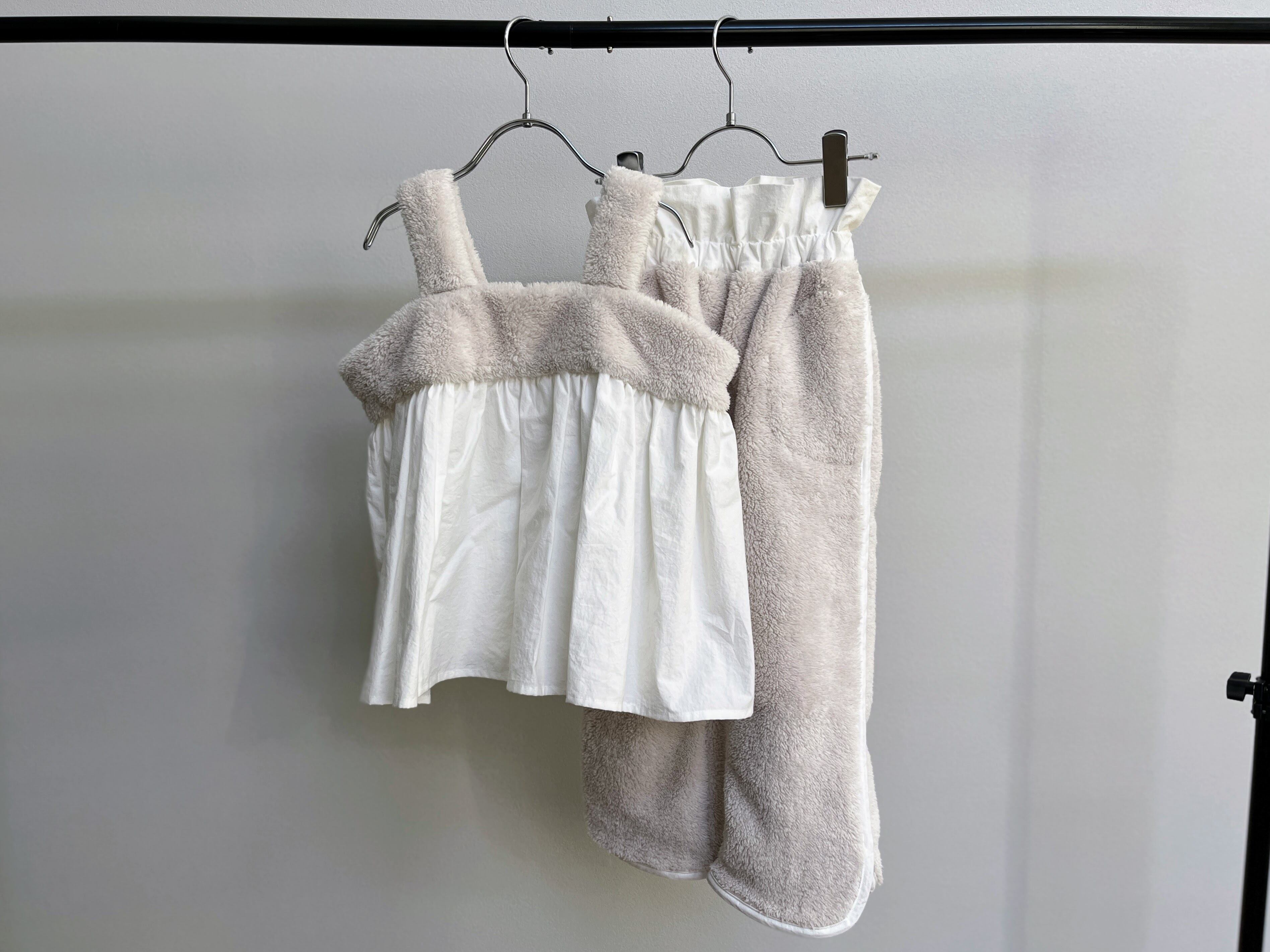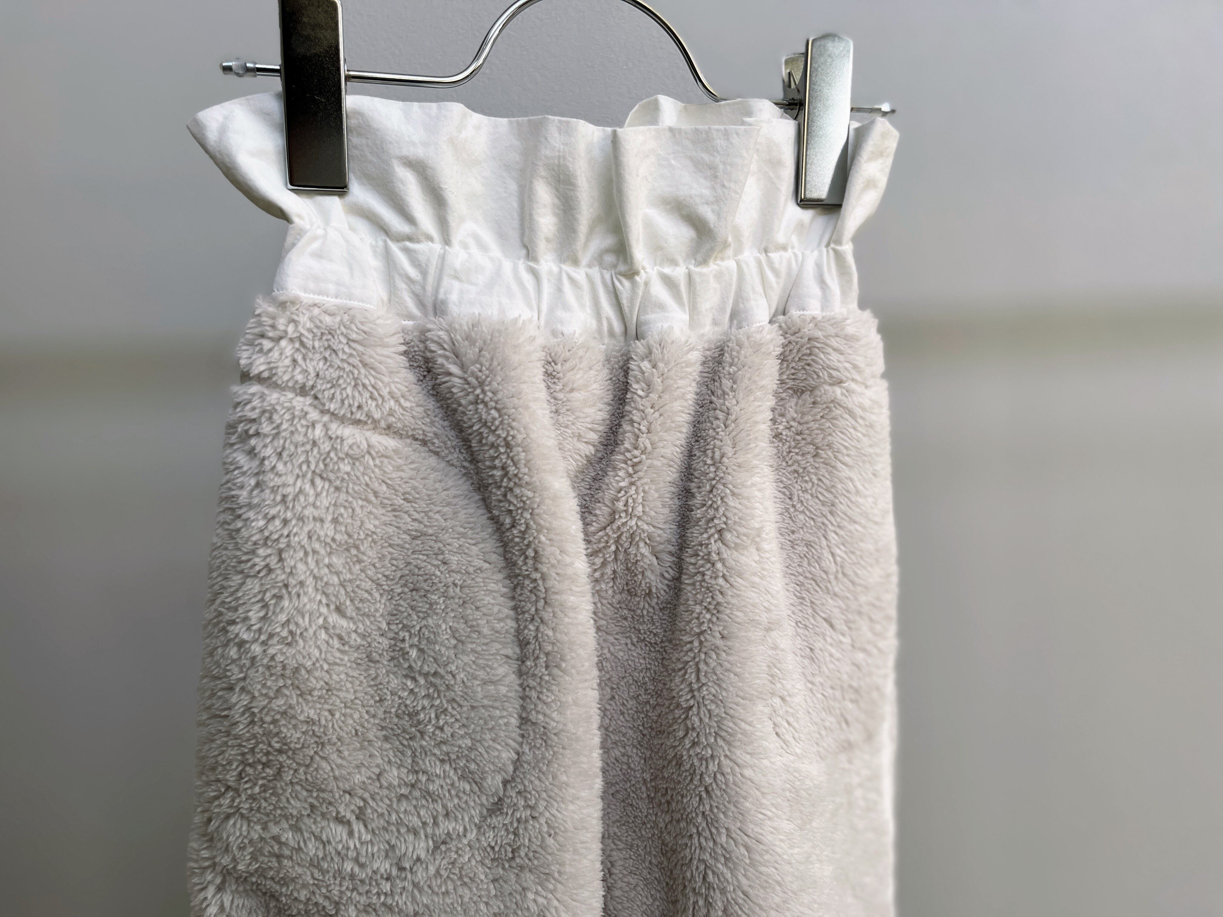 ボアでもボリュームが出すぎず、ゆったりめのトップスともコーディネートが決まります。ウエストINするとウエストのフリルが際立ちます。
